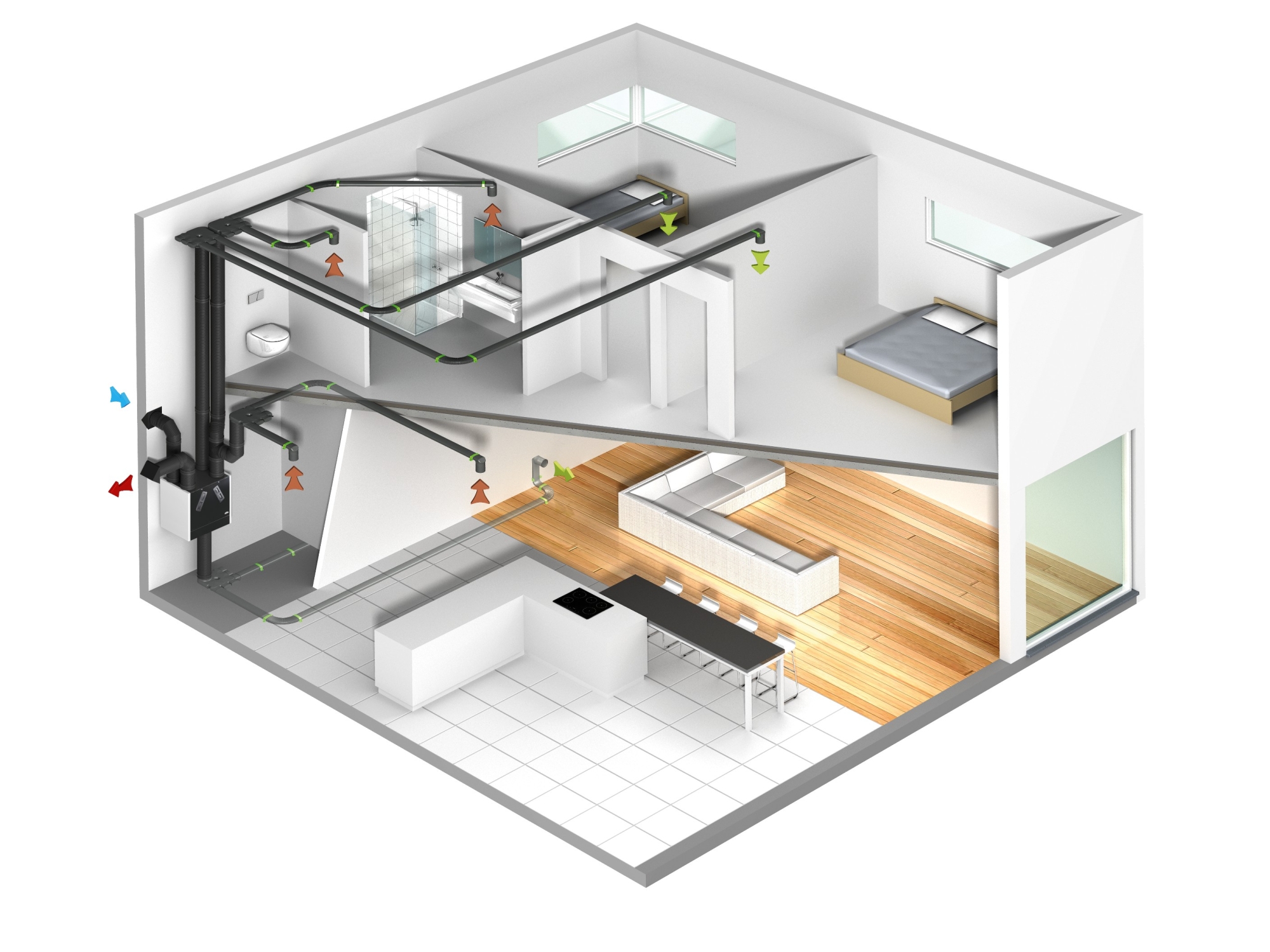 Zastosowanie EPP jak podstawowego materiału całej konstrukcji rekuperatorów BOOST , wysokiej klasy wentylatory i wymiennik, również w wariancie odzyskującym wilgoć, decydują o wysokiej efektywności energetycznej i trwałości systemu wentylacji z rekuperatorem KERMI BOOST.