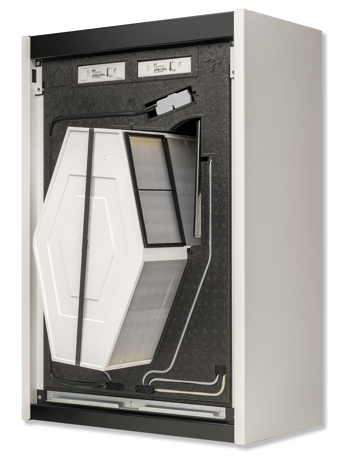 Dla nawiewu świeżego powietrza do pomieszczeń filtry F7 (wg normy DIN EN ISO 16890: ISO ePM1 55%) oraz M5 (ePM10 50%) dla wywiewu celem ochrony wymiennika.